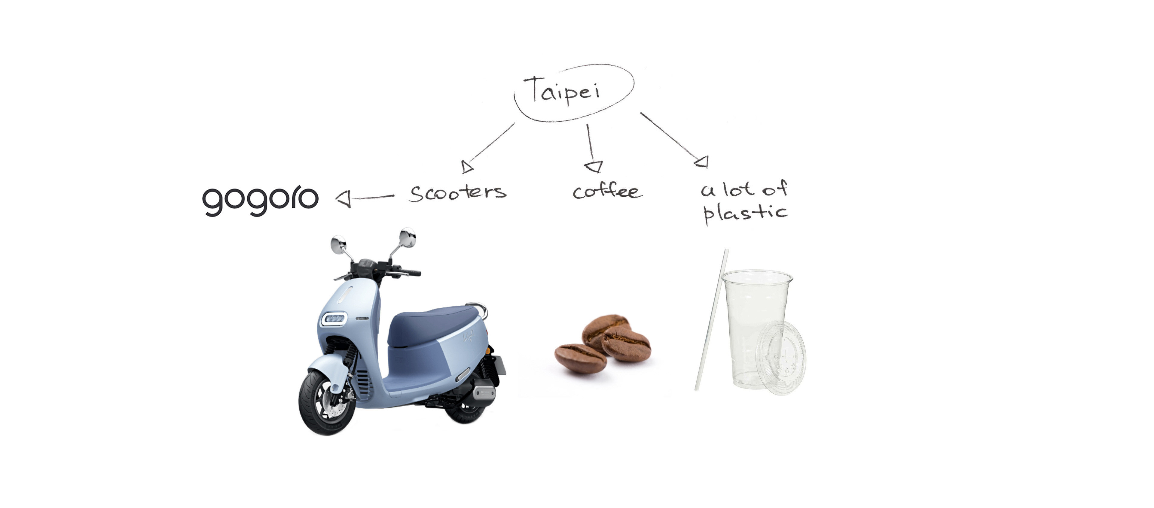 I identified 3 words associated with Taipei: motorized scooters, coffee* and a lot of plastic packaging**.